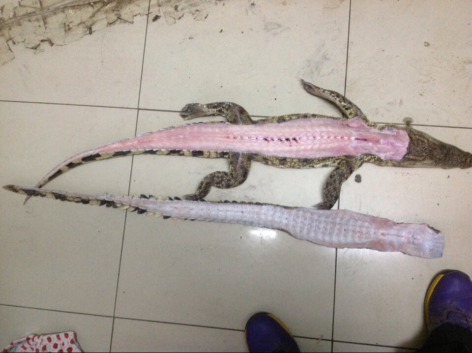 1.首先将小鳄鱼{约32CM-50CM}肚子朝上,平躺放好。然后用刀片在小鳄鱼整个身体从上到下三分之二处轻轻划开,一直划到小鳄鱼尾部。